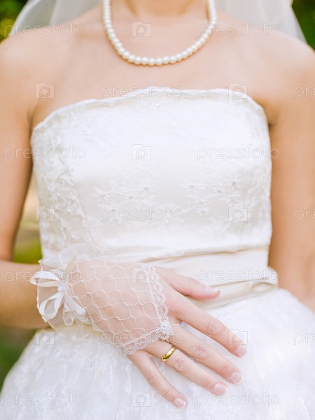 Руки невесты с кольцом на свадебном платье