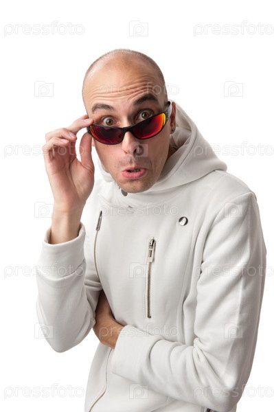 Человек с удивленным выражением лица на белом фоне