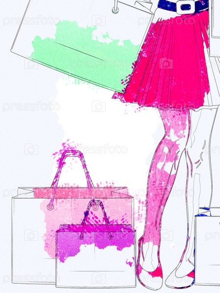 Акварель, ноги женщины с покупками