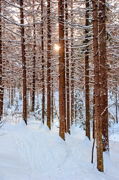 Солнце светит через сосновые стволы в зимнем лесу