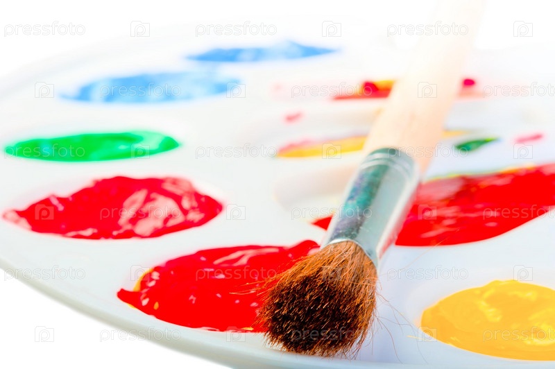 Кисть художника на белой палитре с красками