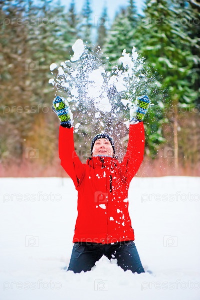 Девушка бросает снег в воздух. Женщина находится в фокусе