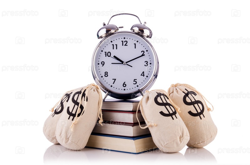 Мешки денег и будильник на белом фоне