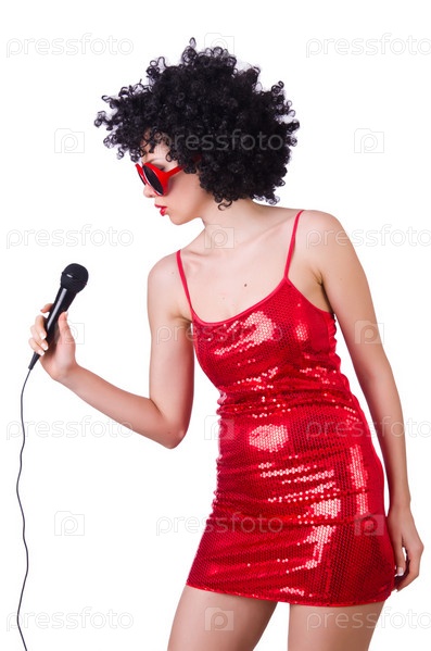 Поп-звезда в красном платье с микрофоном на белом фоне