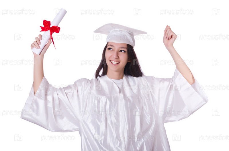 Молодая студентка с дипломом на белом фоне