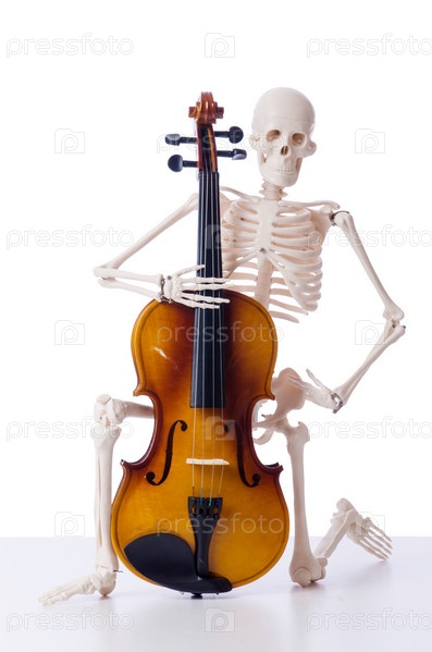 Скелет играет на скрипке, изолированный на белом
