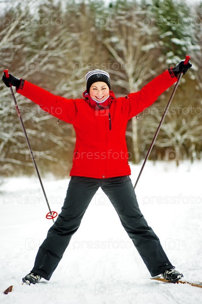 Счастливая девушка позирует на лыжах в зимнем лесу
