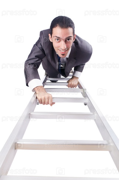 Бизнесмен поднимается по лестнице, изолированный на белом фоне
