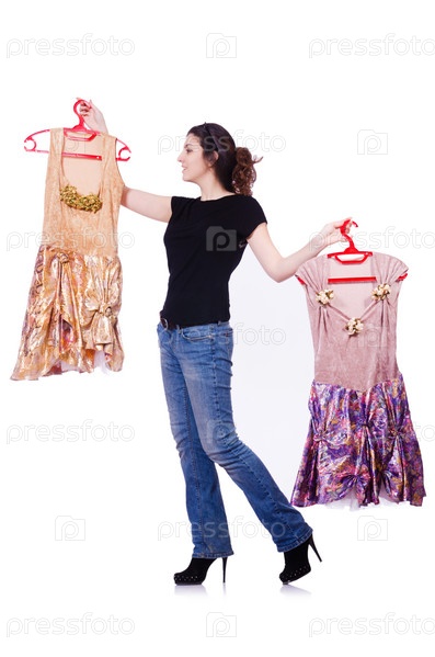 Женщина выбирает платье на белом фоне