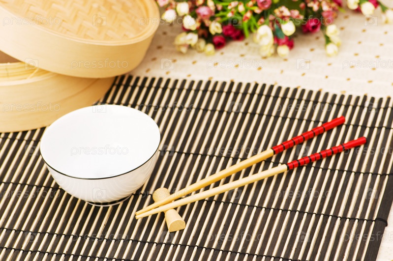 Палочки и чаша на бамбуковом коврике