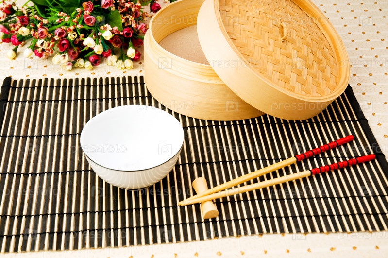 Палочки и чаша на бамбуковом коврике