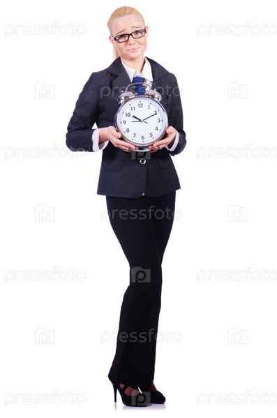 Женщина с гигантскими часами на белом