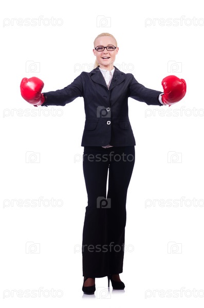 Бизнес-леди с боксерскими перчатками на белом