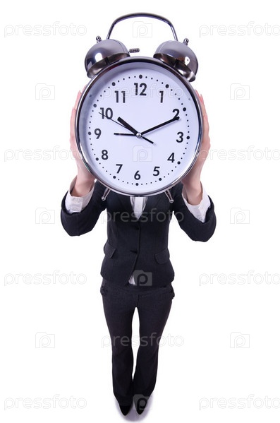 Смешная женщина с часами на белом фоне