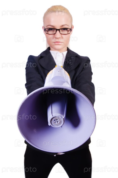 Юизнес-леди с громкоговорителем на белом