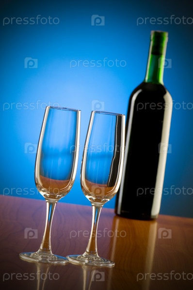 Два фужера и бутылка вина на синем фоне