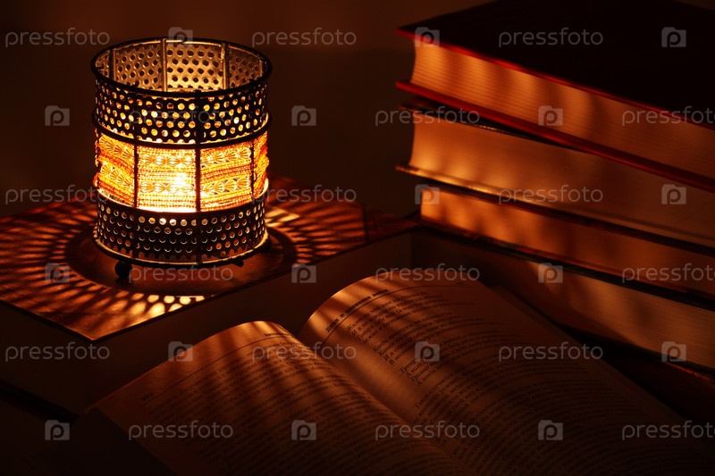 Подсвечник с горящей внутри свечой и несколько книг