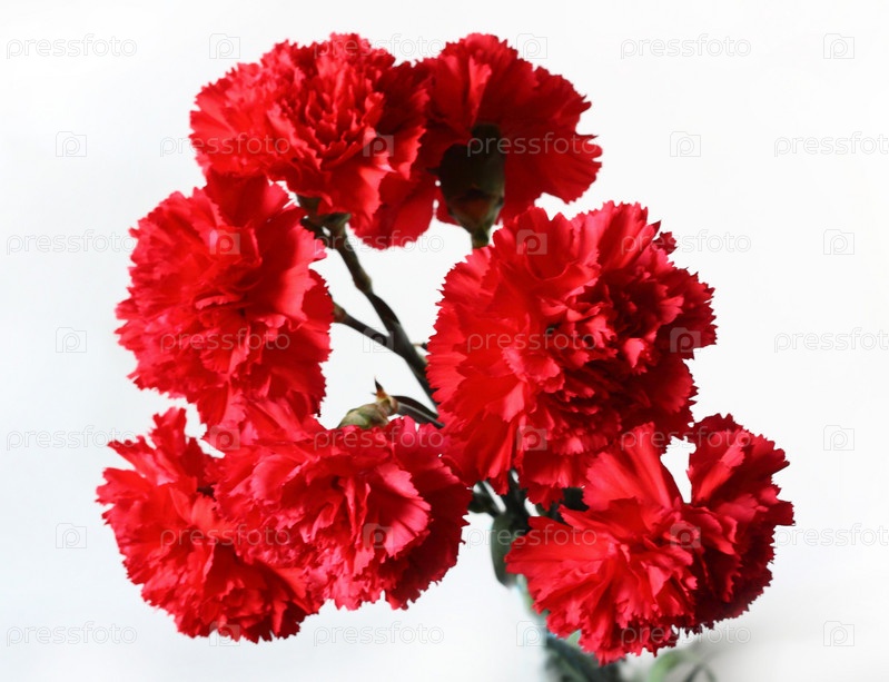 Семь красных гвоздик в букете стоят вертикально на светлом фоне