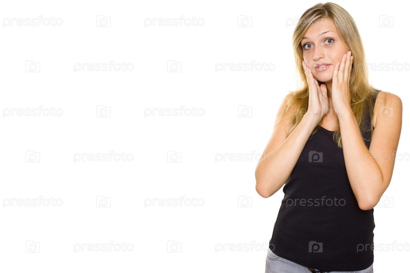 Удивленная женщина на белом фоне