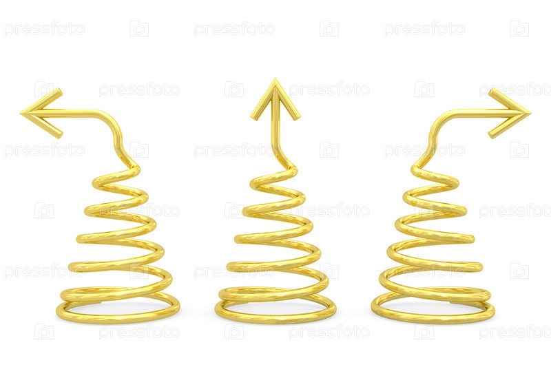 Золотые спирали с разными направлениями на белом фоне. 3D изображение высокого разрешения