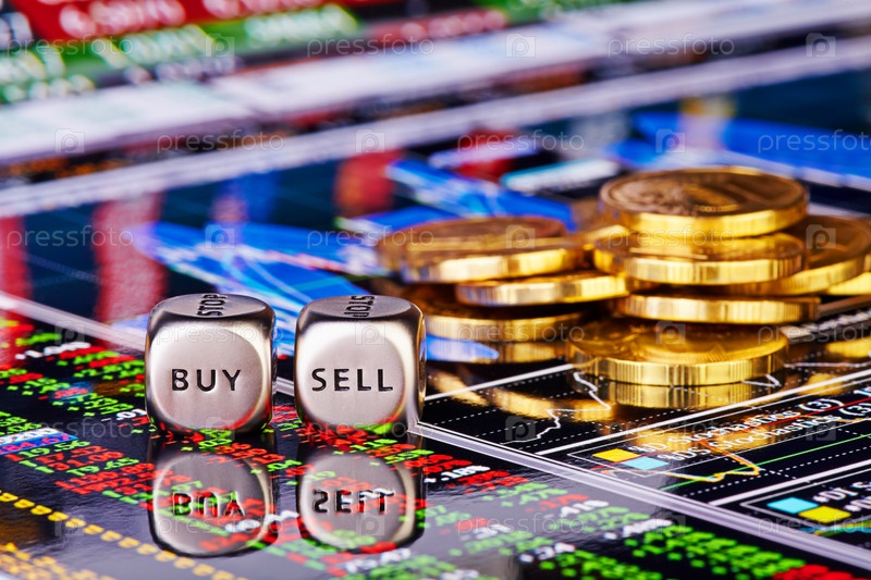 Кости со словами "продать" и "купить", золотые монеты и финансовые диаграммы со столбцами котировок. Выборочный фокус