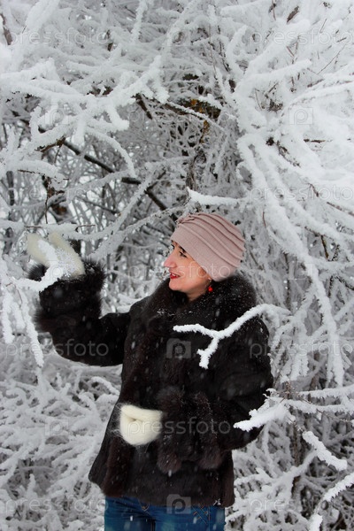 Счастливая женщина в зимнем лесу