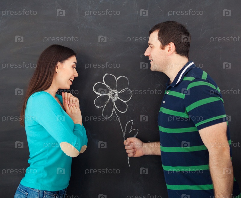 Молодая пара с цветком ромашки. Рисунок мелом на темном фоне