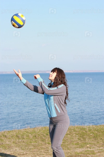 Девушка в спортивном костюме играет с мячом