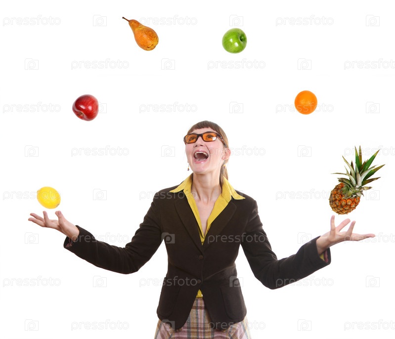 Женщина жонглирует фруктами