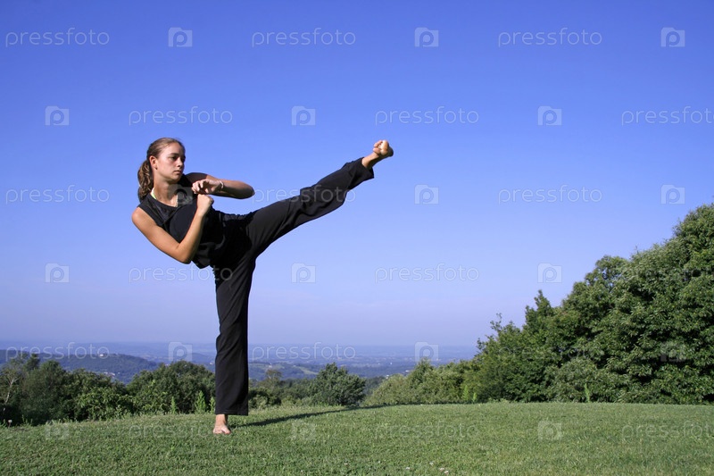 Привлекательная молодая женщина обучается приемам самообороны