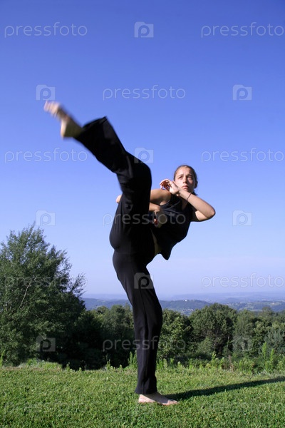 Удар ногой. Привлекательная молодая женщина обучается приемам самообороны