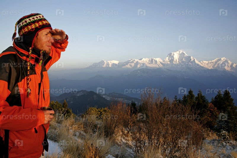 Альпинист смотрит на горный хребет
