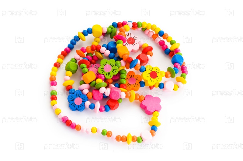 Детские разноцветные бусы на белом фоне