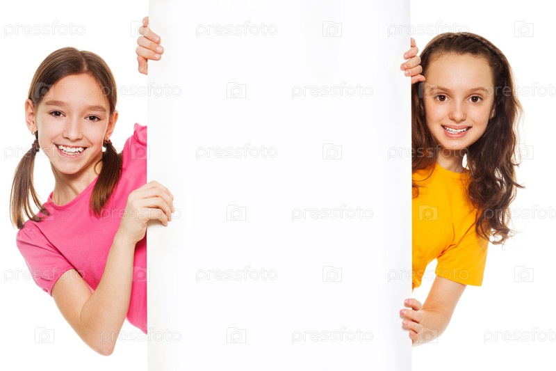 Две счастливые девочки и информационным щитом
