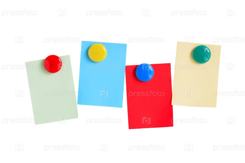 Маленькие листы бумаги с цветными магнитами на белом фоне