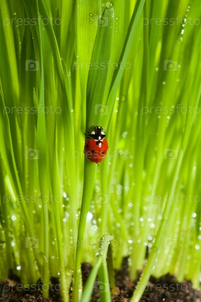 Мокрая божья коровка в зеленой траве
