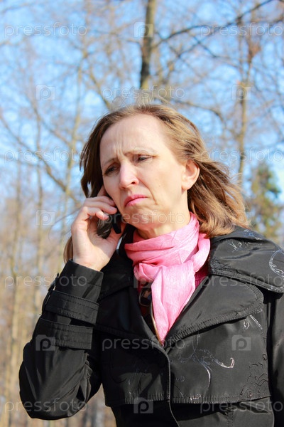 Женщина в черном плаще разговаривает по мобильному телефону на открытом воздухе