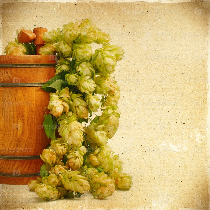 Винтажный фон с деревянной бочкой и плодами хмеля