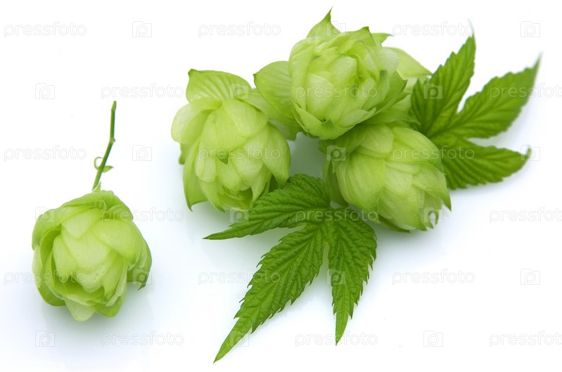 Цветки хмеля с листьями на белом фоне