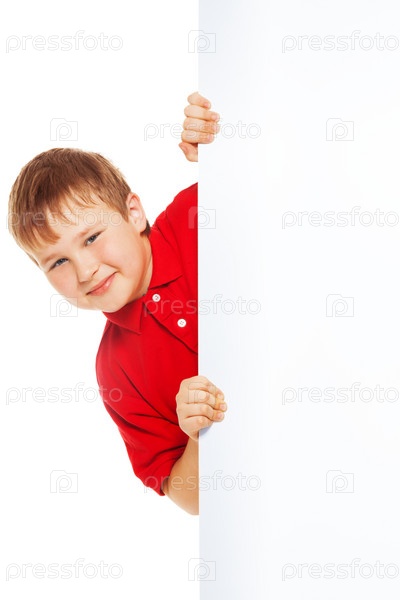 Мальчик в красной рубашке с пустым баннером