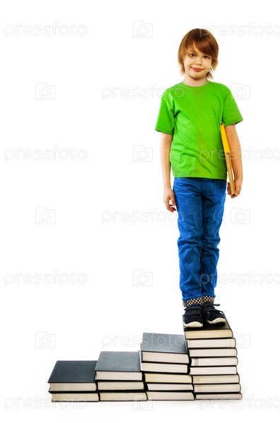 Мальчик стоит на лестнице из книг