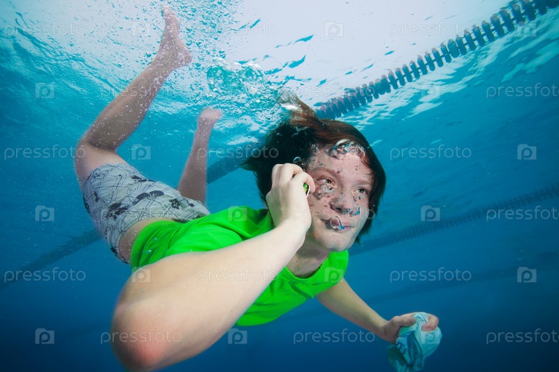 Мужчина говорит по мобильному телефону под водой