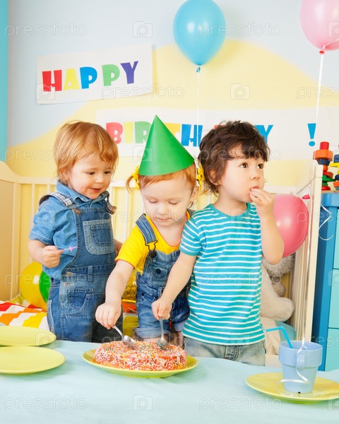 Трое детей едят именинный торт