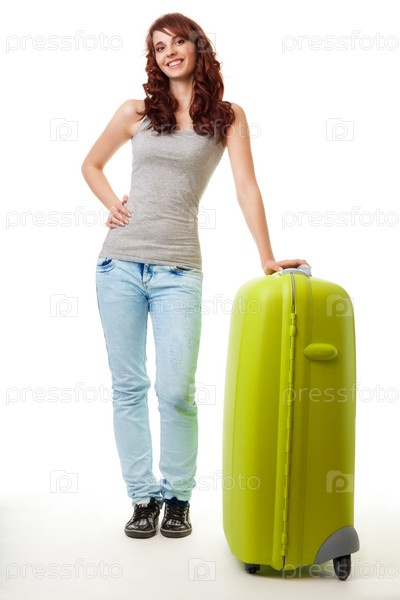 Счастливая симпатичная девушка стоит с зеленым чемоданом