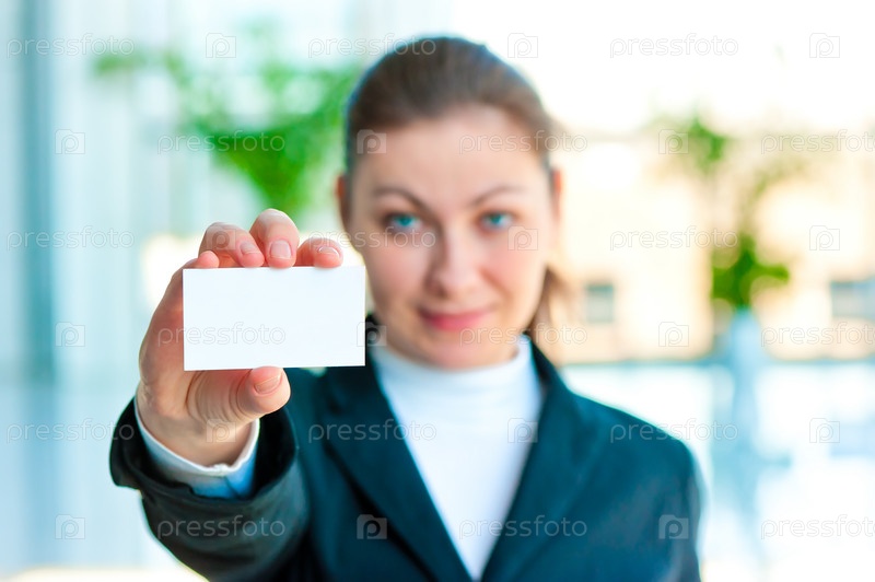 Улыбающийся менеджер держит пустую визитную карточку