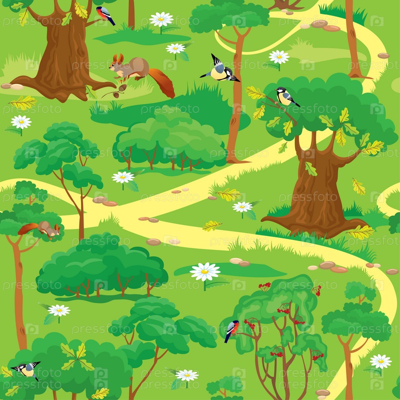 Бесшовный узор - зеленый лесной пейзаж с деревьями, цветами, птицами и белками