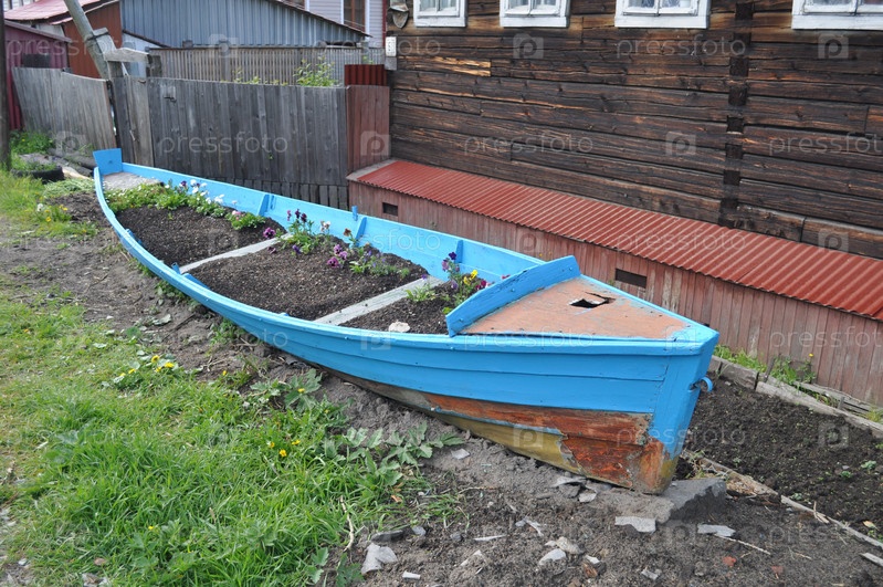 Архангельск. Соломбала. Старая деревянная лодка, превращенная в цветочную клумбу