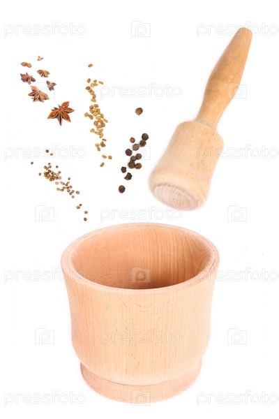 Деревянная ступка для специй. Коллаж, изолированный
