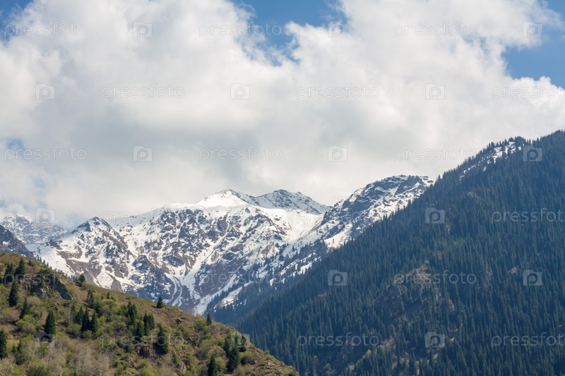 Зеленый хвойный лес в горах и голубое небо в Алматы, Казахстан