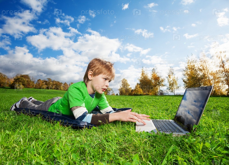 Милый мальчик использует интернет в парке